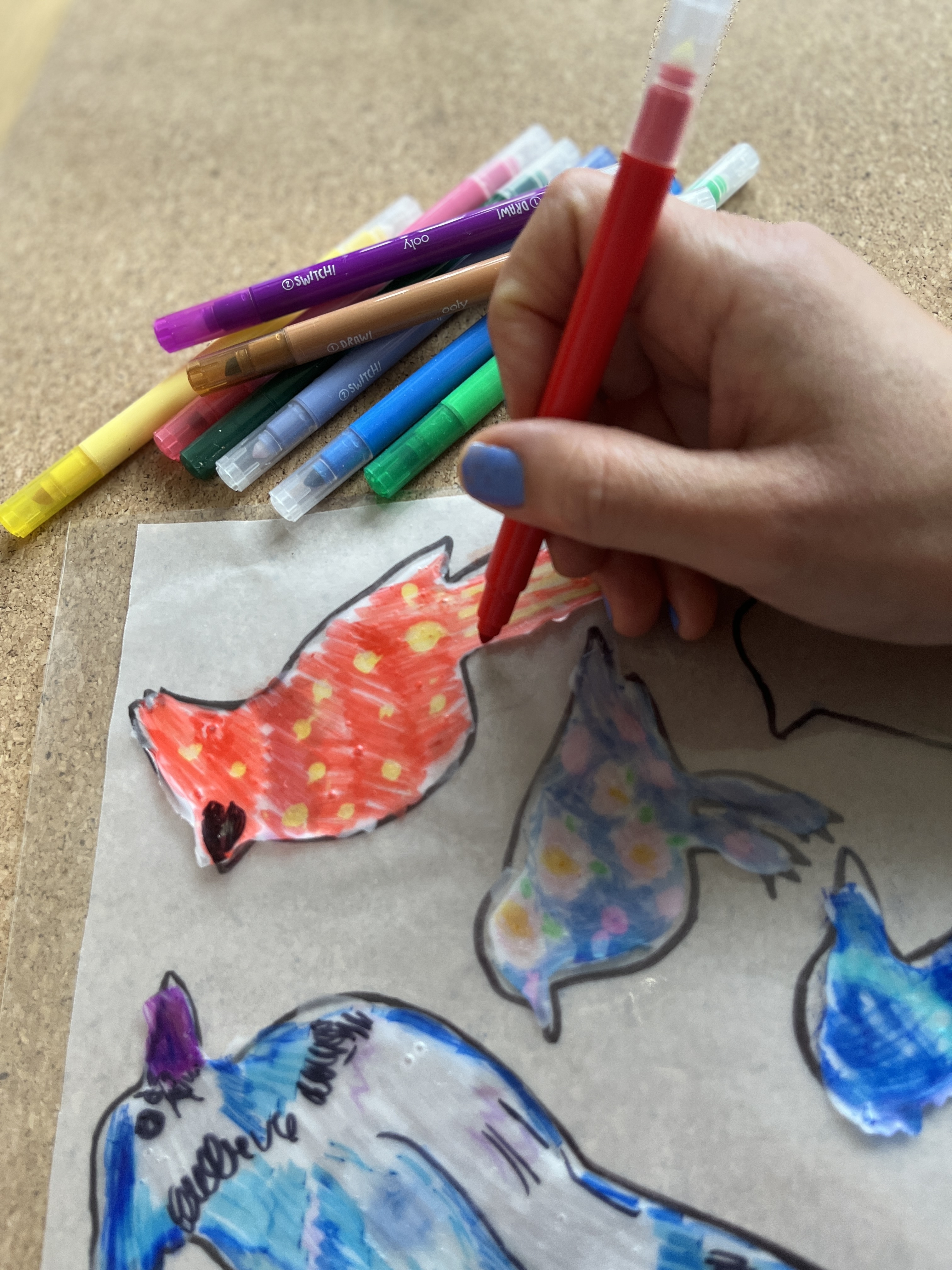 Una vez que los adhesivos estén completamente secos, ¡es hora de colorear! Dejando los adhesivos en el plástico, usa marcadores, permanentes o marcadores a base de agua están bien.